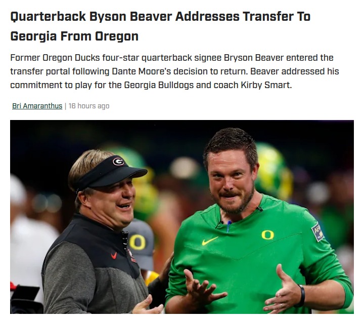 Chad Williams+FollowBeaver Bolts: QB Shakeup After Raiola Joins DucksThe Dawgs just landed a big one! Bryson Beaver, the former four-star Duck, is heading to Athens after Oregon’s QB room got packed with Dante Moore staying and Dylan Raiola transferring in. Beaver’s quick flip from “Home sweet home” in Eugene to suiting up for Kirby Smart’s Bulldogs is wild. With Gunner Stockton wrapping up his run, Beaver could be the next big thing in the SEC. Thoughts on how this impacts the Dawgs’ QB battle? #Sports #Football #GoDawgs00Share