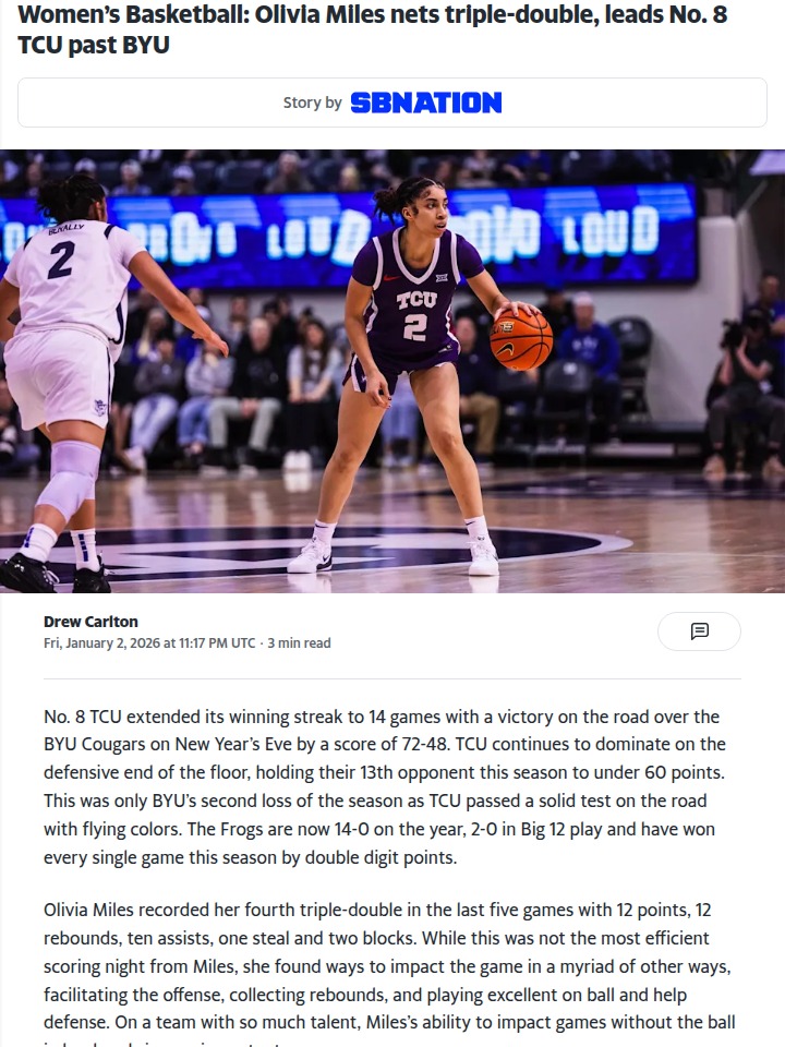 Susan Reeves+FollowOlivia Miles Triple-Double Sparks FrogsFrog fans, how about Olivia Miles? The do-it-all point guard just notched her fourth triple-double in five games, leading the No. 8 Horned Frogs to a dominant win over BYU. TCU’s defense was lights out again, holding the Cougars to just 48 points and forcing 17 turnovers. With five Frogs in double figures and the bench stepping up, this squad looks ready to defend their Big 12 crown. Can anyone slow down Miles and the Frogs’ 14-0 run? #Sports #Basketball #GoFrogs10Share
