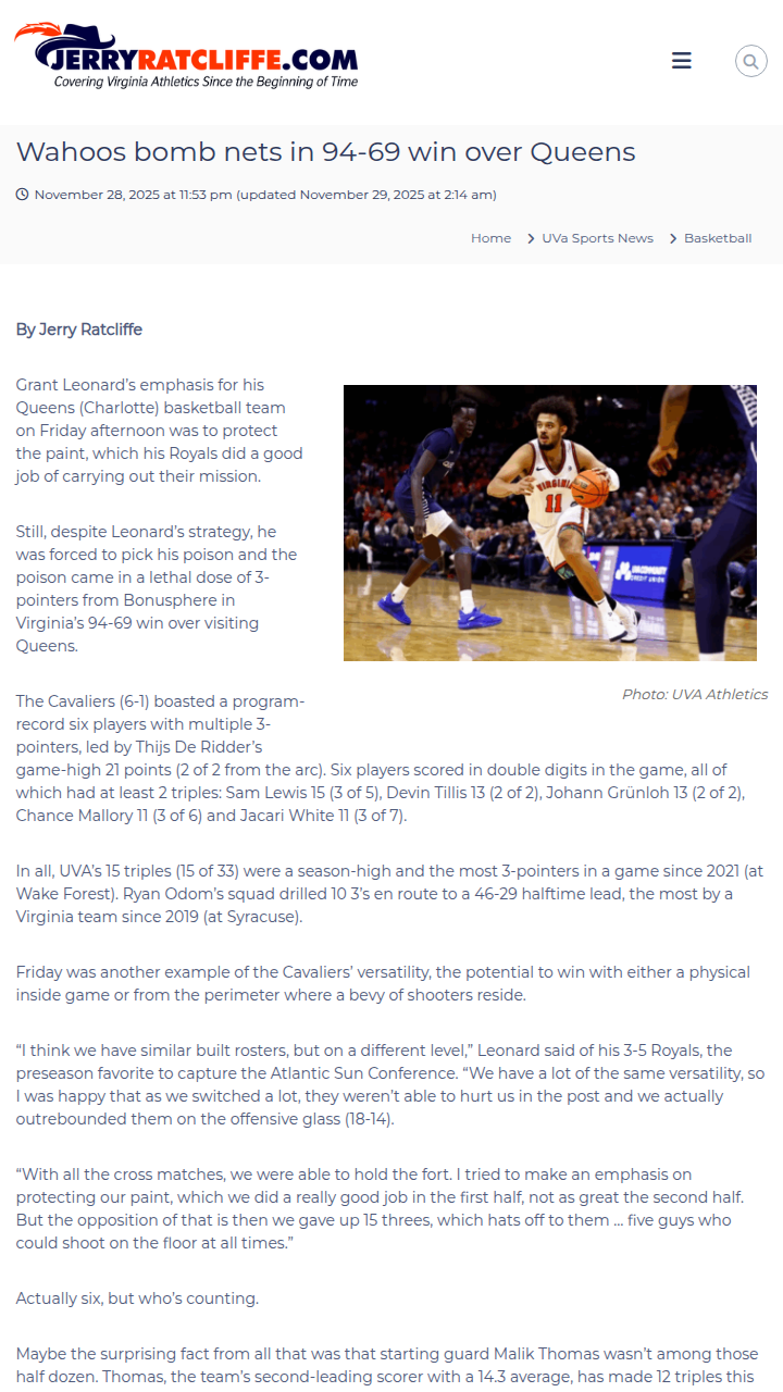 Amy Tanner+FollowWahoos rain threes in record-breaking winVirginia basketball just put on a shooting clinic, lighting up Queens with a program-record six players hitting multiple 3-pointers in a single game! The Cavaliers nailed 15 threes and had six guys in double figures, showing off a level of depth and versatility that’s tough to match. Thijs De Ridder led the charge with 21 points, but it was truly a team effort—every shooter got hot. Even with Queens locking down the paint, UVA’s perimeter firepower was too much. Is this the most balanced Wahoos squad we’ve seen in years? Let’s hear your thoughts on how far this team can go! #Sports #Basketball #GoHoos00Share