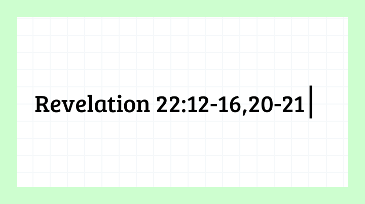 And, behold, I come quickly; and my reward is with me, to give every man according as his work shall be. [13] I am Alpha and Omega, the beginning and the end, the first and the last. [14] Blessed are they that do his commandments, that they may have right to the tree of life, and may enter in through the gates into the city. [15] For without are dogs, and sorcerers, and whoremongers, and murderers, and idolaters, and whosoever loveth and maketh a lie. [16] I Jesus have sent mine angel to testify unto you these things in the churches. I am the root and the offspring of David, and the bright and morning star. [20] He which testifieth these things saith, Surely I come quickly. Amen. Even so, come, Lord Jesus. [21] The grace of our Lord Jesus Christ be with you all. Amen.