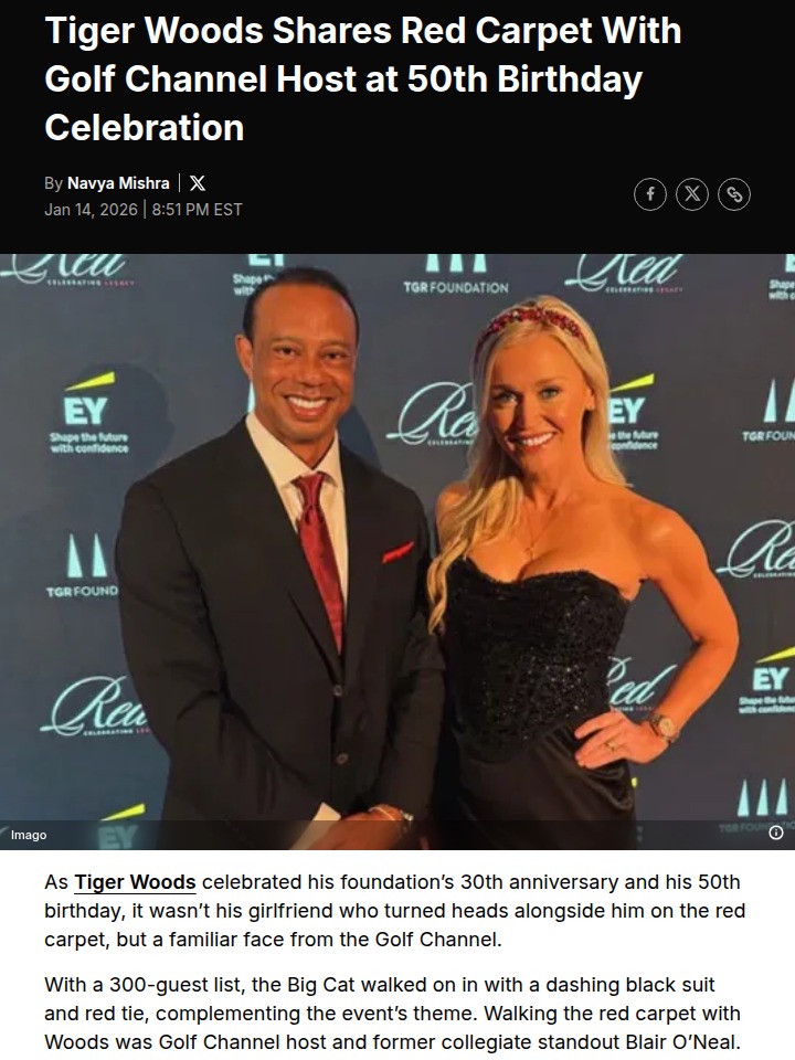 Michael Singh+FollowBig Cat’s Red Carpet Surprise at 50!Tiger’s 50th birthday bash was more than just a milestone—it was a star-studded celebration of his TGR Foundation’s 30-year legacy. But the real buzz? The Big Cat hit the red carpet not with his girlfriend, but with Golf Channel’s Blair O’Neal. Fans are loving the duo’s style and the Golf Channel’s deep ties to Tiger’s journey. Did you expect this pairing? Let’s talk! #Sports #Golf #TigerWoods00Share