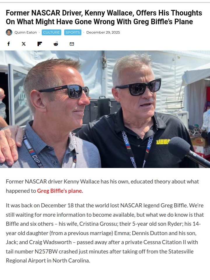 andersonkaren+FollowKenny Wallace Weighs In on Biffle CrashTough week for the NASCAR family. Herm (Kenny Wallace) just dropped his thoughts on what might have caused Greg Biffle’s tragic plane crash. He thinks the Cessna lost an engine right after takeoff, and with too much drag and not enough power, they couldn’t make it back to the runway. Wallace is careful to say it’s just his opinion, but it’s a heartbreaking loss for the sport. Thoughts? #Sports #NASCAR #GregBiffle60Share
