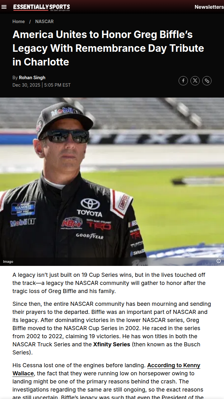 romankimberly+FollowCharlotte honors Greg Biffle’s legacyCharlotte is coming together this Friday to remember NASCAR legend Greg Biffle and the six others lost in December’s tragic plane crash. The public memorial at Bojangles Coliseum starts at 11 a.m. and will be streamed live for those who can’t attend in person. Biffle’s impact on racing—and on so many fans—runs deep, with 19 Cup Series wins and multiple championships. For many in our community, this is a chance to celebrate his life and share memories. How has Greg Biffle’s story touched you or your family? #Sports #Racing #GregBiffle00Share