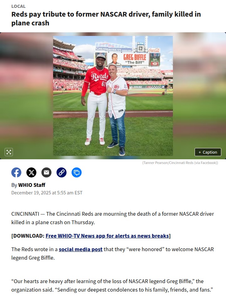 Bruce Johnson+FollowNASCAR legend Greg Biffle remembered by RedsThe loss of Greg Biffle and his family in a tragic plane crash has left both the NASCAR and Cincinnati Reds communities in shock. Biffle wasn’t just a champion on the track—he was a true friend and inspiration to many, with over 50 career wins and a reputation for integrity and passion. The Reds honored him, reflecting how sports can bring people together in moments of both triumph and heartbreak. How do you think communities should come together to support each other after such losses? #Sports #GregBiffle #NASCAR180Share