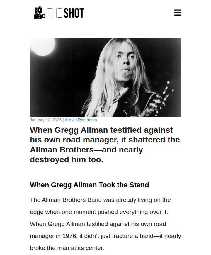 charles39+FollowGregg Allman’s Testimony 💔 Band Betrayal?Gregg Allman testifying against his own road manager in 1976 wasn’t just a legal drama—it tore the Allman Brothers Band apart and left fans totally divided. Was Gregg a traitor for taking the stand, or was he just trapped by the law? Some say the band never recovered from that moment, and Gregg himself admitted the guilt haunted him for years. The debate over loyalty vs. survival still rages in the fandom! #Entertainment #Music #GreggAllman10Share