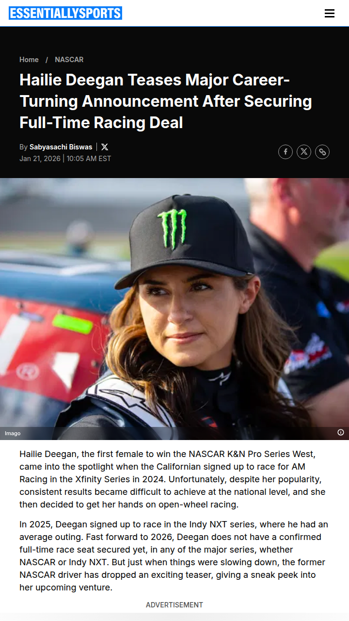 Jason Smith+FollowDeegan Drops Cryptic Full-Time Racing TeaseLooks like Hailie Deegan, the trailblazer from Cali, is keeping us guessing again! After a tough rookie Indy NXT season and no locked-in seat for 2026, she just teased a major full-time deal. Could she be switching series or sticking with HMD? The suspense is real—her next move could shake up the racing scene. Anyone else hoping for a Deegan comeback story? #Sports #Racing #HailieDeegan00Share