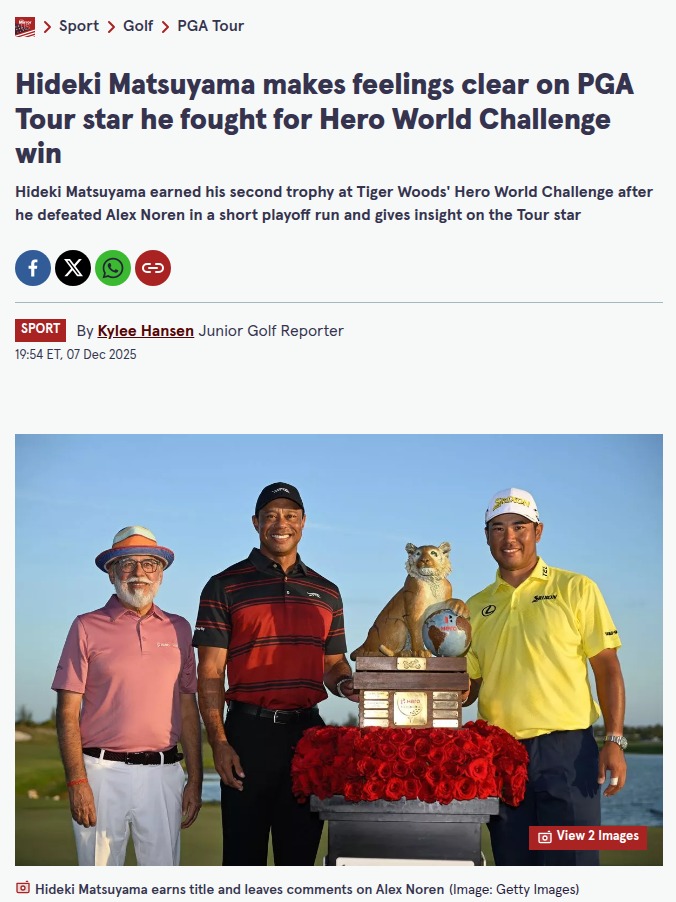 Michael Singh+FollowMatsuyama’s Hero World Challenge Eagle DuelWhat a finish at Tiger’s Hero World Challenge! Hideki Matsuyama pulled off a clutch eagle on 10, then outlasted Alex Noren in a playoff. Matsuyama credited Noren for pushing him to his best, saying Noren’s approach inspired his own shot. The playoff was short and sweet—Matsuyama birdied, Noren missed. Two-time champ at Tiger’s event now! Anyone else think Matsuyama’s eagle was the turning point? #Sports #Golf #HeroWorldChallenge00Share