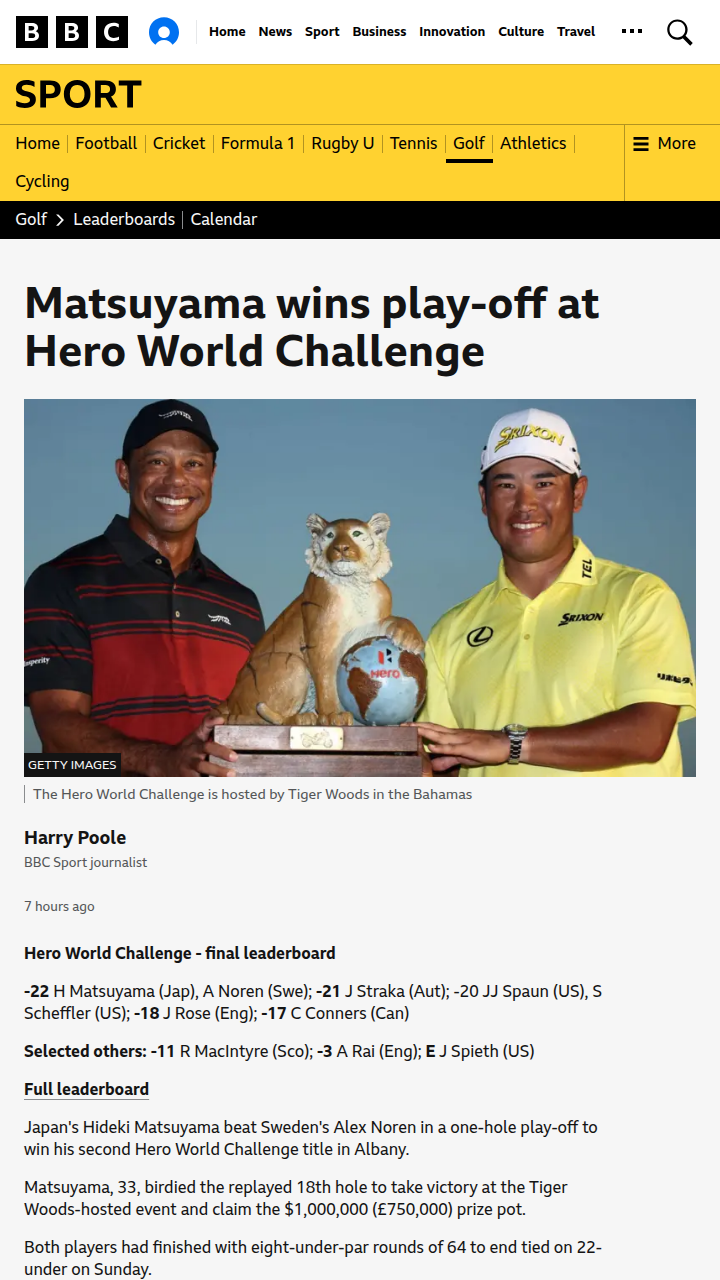 Michael Singh+FollowMatsuyama Clinches Hero World ChallengeWhat a finish at the Tiger-hosted Hero World Challenge! Hideki Matsuyama, aka Japan’s golf ace, outdueled Sweden’s Iceman Alex Noren in a dramatic one-hole playoff, birdieing 18 to seal his second title at Albany. Both finished at -22, but Matsuyama’s nerves of steel took the $1M prize. Props to Straka for keeping it close and Scheffler for a solid defense, but this was Hideki’s moment. Anyone else think that playoff hole was pure clutch? #Sports #Golf #HeroWorldChallenge00Share