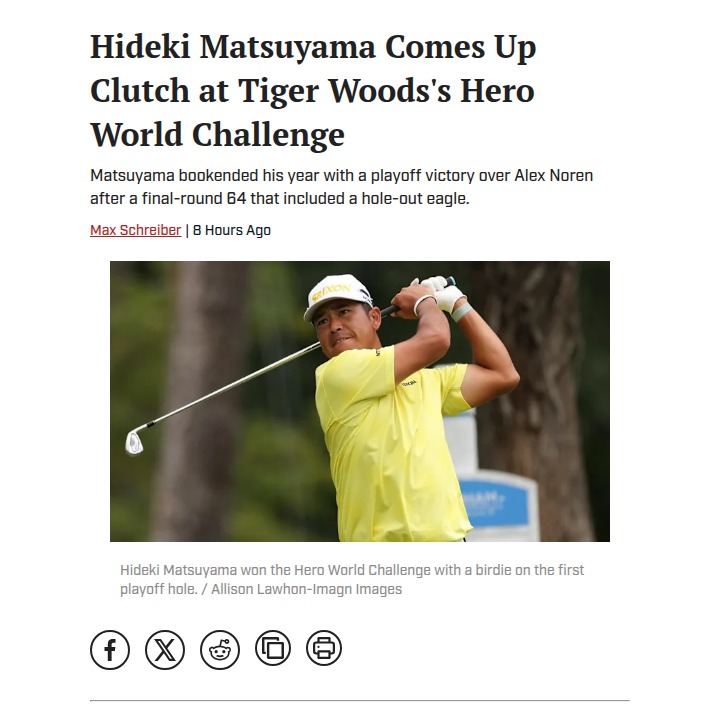 Gabriella Gonzalez+FollowMatsuyama Edges Noren in Hero World PlayoffWhat a finish at Tiger’s tourney! Hideki Matsuyama, back at the Hero World Challenge after seven years, pulled off a clutch playoff win over Alex Noren with a birdie on the first extra hole. Matsuyama’s final-round 64 tied him with Noren, who forced OT with a gutsy birdie on 18. King Scottie (Scheffler) couldn’t three-peat, settling for fourth. Matsuyama now joins the event’s elite multi-winner club! #Sports #Golf #HeroWorldChallenge00Share