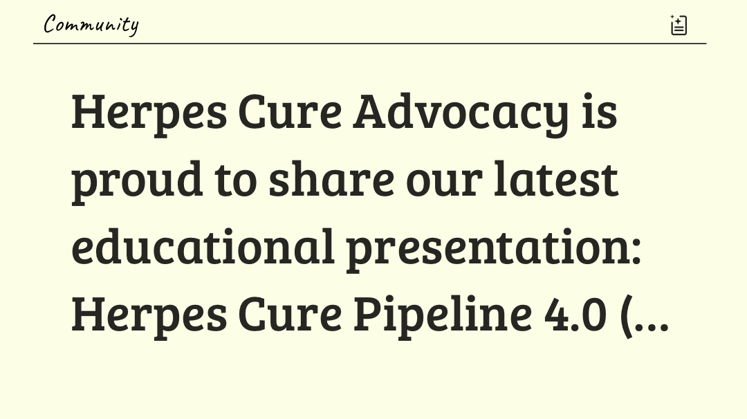 Reina Samaro+FollowHerpes Cure Advocacy is proud to share our latest educational presentation: Herpes Cure Pipeline 4.0 (2025). This video provides a comprehensive update on current herpes cure research, emerging therapies, and long-acting innovations shaping the future of HSV treatment. Our mission is to educate, advocate, and accelerate progress toward a cure through awareness, research, and community engagement. Watch here: https://youtube.com/watch?v=lGD6vHTAb5k #HerpesCure #MedicalResearch #ClinicalTrials #PublicHealth #Biotech #Virology #PatientAdvocacy10Share