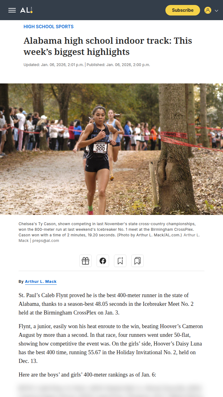 Bruce Johnson+FollowAlabama track stars light up BirminghamCaleb Flynt’s 48.05 in the 400 meters at the Birmingham CrossPlex just set the bar for high school runners across Alabama—he didn’t just win, he dominated by over a second! On the girls’ side, Hoover’s Daisy Luna clocked a speedy 55.67. But it wasn’t just about individual glory: Hoover’s boys and girls teams racked up wins in sprints, hurdles, relays, and field events, while Hazel Green and Central-Phenix City made their own statements in earlier heats. The competition is fierce, and these athletes are raising the standard. Which performance impressed you most? #Sports #AlabamaTrack #HighSchoolSports00Share