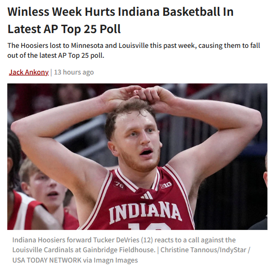 CrimsonChameleon+FollowIndiana hoops drop from Top 25—what’s next?Indiana basketball fans just felt the sting of a winless week, with the Hoosiers tumbling out of the AP Top 25 after tough losses to Minnesota and Louisville. That early-season optimism around Coach Darian DeVries is getting tested fast. The Hoosiers now sit just outside the rankings, and the Big Ten’s landscape is shifting—Michigan is up, Purdue and Louisville are down, and new teams are breaking in. Is this just a rough patch, or a sign of deeper issues? How do you see Indiana bouncing back, and who’s your pick for the conference’s top dog now? #Sports #IndianaBasketball #Hoosiers00Share
