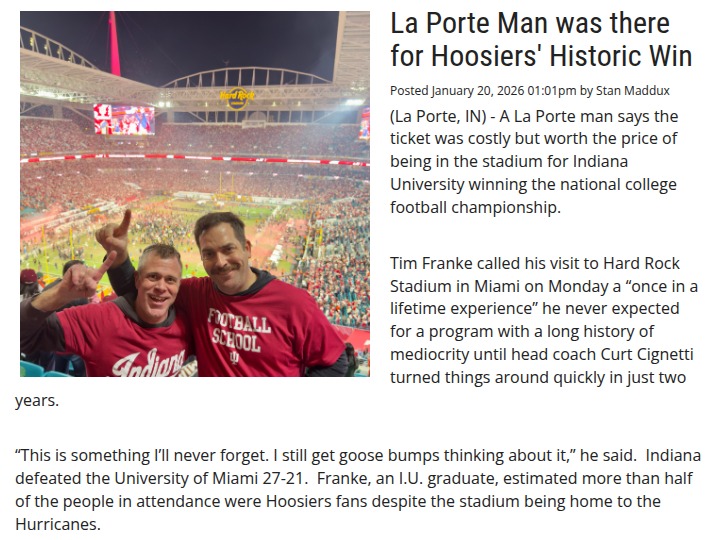 phughes+FollowHoosiers fans take over Miami for historic winIndiana University’s stunning national championship win in Miami wasn’t just a victory on the field—it was a sea of Hoosiers fans taking over Hard Rock Stadium! Tim Franke from La Porte called the pricey ticket a small price for witnessing IU’s turnaround under Coach Curt Cignetti. The energy was electric, with IU chants echoing louder than the home crowd. Franke, still hoarse from cheering, said reconnecting with old classmates made the night even more unforgettable. For longtime fans, this moment felt like a dream come true. How are you celebrating IU’s historic win? #Sports #Football #Hoosiers00Share