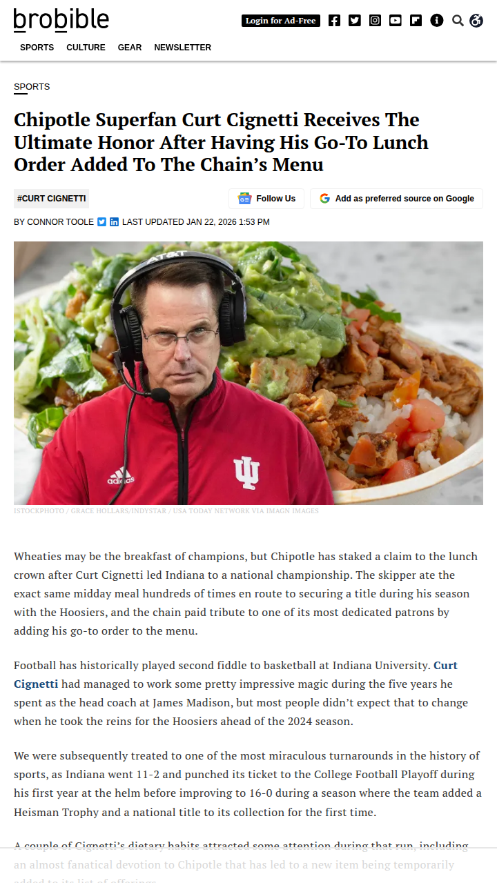 Michael Pitts+FollowCurt Cignetti’s “I Win” Bowl Hits Chipotle!Hoosier Nation, how about this? Coach Curt Cignetti just scored big off the field—Chipotle added his famous “I Win” Bowl to the menu after his miracle run with Indiana! After leading the Hoosiers to a national title, Cignetti’s go-to lunch (brown rice, black beans, chicken, guac) is now a must-try for fans. Love seeing football finally steal the spotlight in Bloomington! Who’s lining up for the Cignetti special? #Sports #Football #Hoosiers00Share