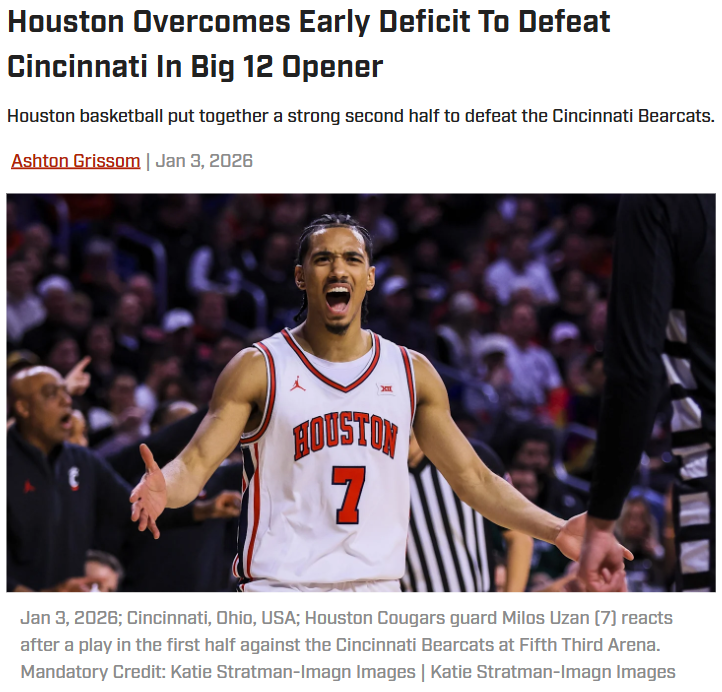 AmberAbyss+FollowHouston rallies late to stun CincinnatiHouston fans just witnessed a gutsy comeback as the Cougars overcame their first halftime deficit of the season to beat Cincinnati 67-60 in the Big 12 opener. Milos Uzan and Kingston Flemings took charge when it mattered most, combining for 37 points and making big plays on both ends. Even with star guard Emanuel Sharp limited by injuries, Houston’s depth and defense shined. With a tough conference schedule ahead, this win could set the tone for the rest of the season. What do you think made the difference in the second half? #Sports #HoustonCougars #Big1200Share
