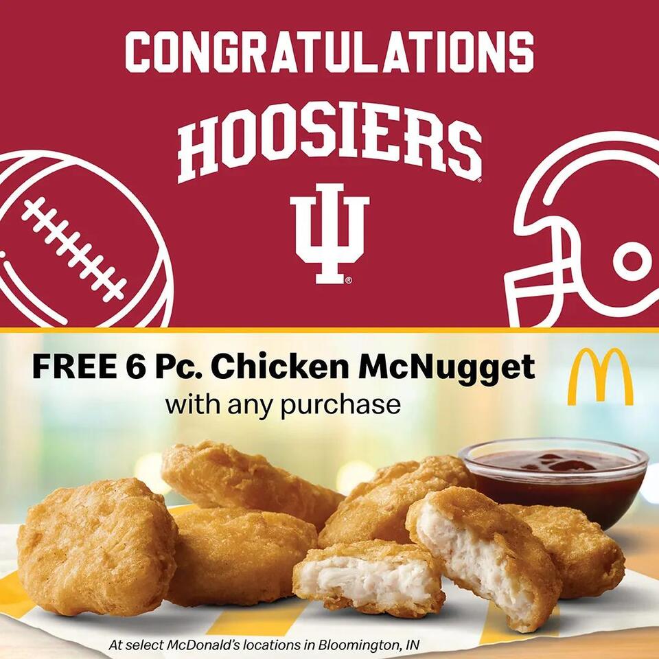 Aaron Taylor+FollowIU fans score free food after championship winIndiana just brought home the national football title, and now Bloomington is celebrating with some serious perks for Hoosier fans. If you’ve got IU gear, Chipotle is handing out buy-one-get-one free entrees statewide this Thursday evening—perfect for a post-game feast. Meanwhile, five McDonald’s locations in Bloomington are giving away free six-piece nuggets with any purchase through Sunday. No minimum spend, just show up hungry! It’s not every day your team’s victory turns into free burritos and nuggets. Who’s planning to cash in? Which spot are you hitting first? #Sports #Football #IUChampions00Share