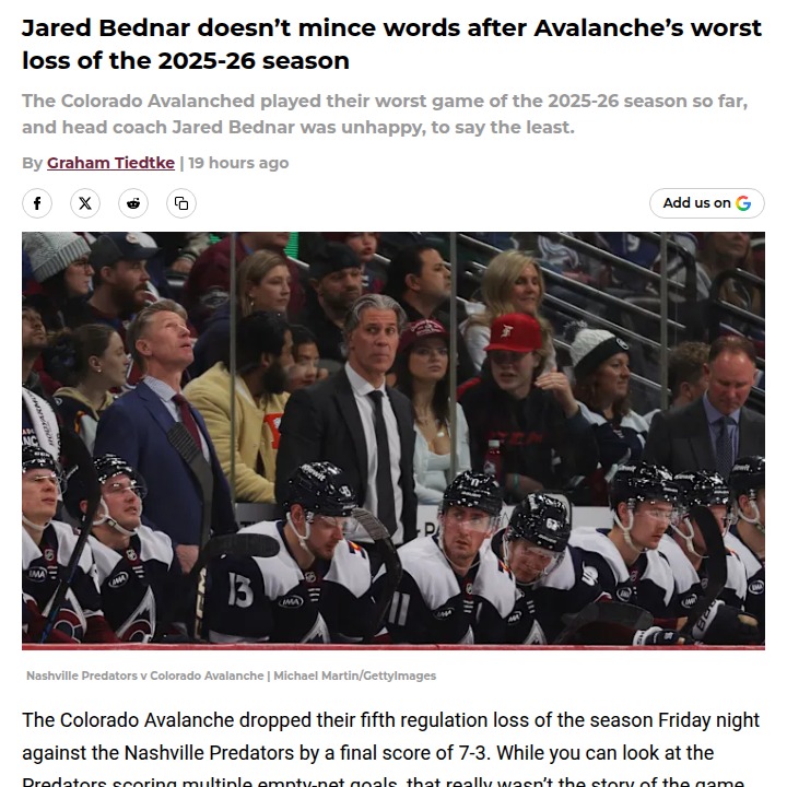 Jordan Leblanc+FollowAvalanche’s rough night: What’s next?A 7-3 loss to the Predators has Avs fans buzzing—not just about the score, but about what’s going wrong. The team’s puck handling led to costly turnovers, and the power play is still struggling, ranking just 25th in the league. Coach Bednar refused to single out players, choosing to keep things focused on the team as a whole. It’s clear frustration is building, and with another game coming up soon, everyone’s wondering: what needs to change for the Avalanche to get back on track? How do you feel about Bednar’s approach and the team’s current struggles? #Sports #IceHockey #Avalanche00Share