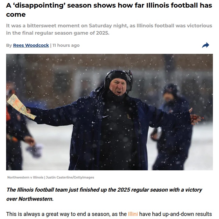 John Camacho+FollowWhy Illinois football fans expect more nowFinishing the season with a win over Northwestern used to be a reason for Illini fans to celebrate, but now, eight wins just feels... disappointing. That’s how much things have changed under Bret Bielema. Remember when we’d be thrilled to hit .500? Now, missing the College Football Playoff stings. It’s wild to realize that disappointment means we actually have real expectations for Illinois football. Bielema’s turned this program around—better recruiting, better play, and, most importantly, hope. How do you feel about the new standards for Illini football? Is this the start of something bigger? #Sports #Football #Illini00Share