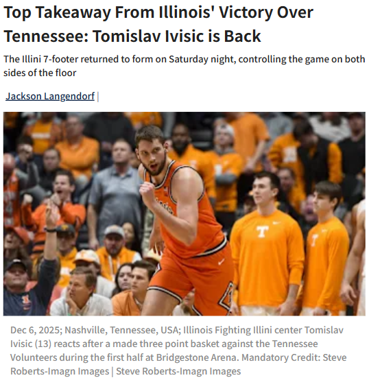 CrimsonChameleon+FollowIllinois hoops just got a major boostTomislav Ivisic looked like a totally different player against Tennessee, and it changed everything for Illinois. After struggling early in the season and battling back from a knee injury, Ivisic put up 16 points, five boards, and three assists—without a single turnover. But the real story was his presence: he anchored the defense, made smart passes, and dominated the paint. Even though Illinois got crushed on the boards, they still beat the 13th-ranked Vols by double digits in Nashville. If Ivisic keeps this up, Illinois could be a real force. What do you think—are the Illini back in the national conversation? #Sports #IllinoisBasketball #TomislavIvisic00Share