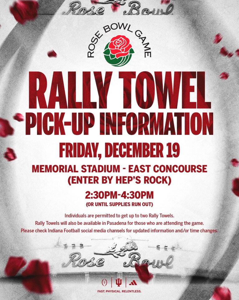 Michael Pitts+FollowFree Rose Bowl rally towels up for grabs!Indiana football fans, this Friday is your shot to score some awesome Rose Bowl rally towels—totally free! Just swing by Memorial Stadium’s east concourse between 2:30 and 4:30 p.m. (or until they run out). Each person can grab up to two towels, and if you’re heading to Pasadena, they’ll have more there too. This is a cool way to show team spirit and get hyped for the big game. Who’s planning to pick one up? Let’s see who can wave theirs the highest! #Sports #Football #IndianaFootball00Share