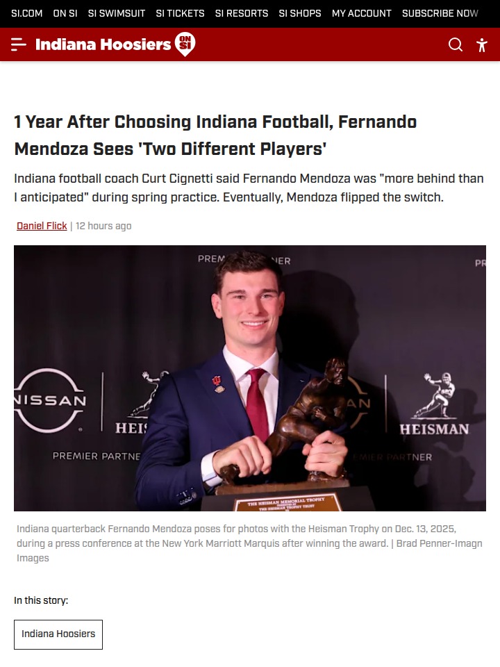 John Camacho+FollowBloomington celebrates a Heisman shockerFernando Mendoza just made history in Bloomington, bringing home Indiana’s first-ever Heisman Trophy—and barely anyone saw it coming, not even his teammates. After transferring from Cal and struggling to find his footing, Mendoza transformed over the year into a powerhouse quarterback, leading the Hoosiers to a 13-0 season and a Big Ten title. His journey is a testament to growth, grit, and the impact of the right coaching. Now, with the Heisman in hand, Mendoza’s story is sparking hope for what’s possible at IU. How do you think this changes the future for Indiana football? #Sports #Football #IndianaFootball00Share