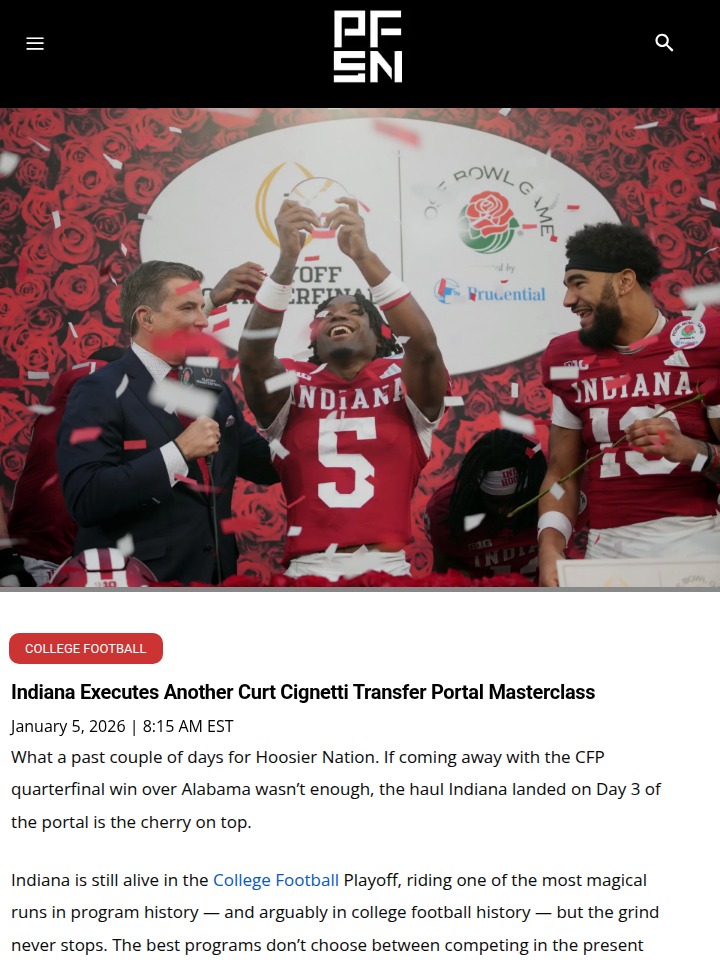 phughes+FollowIndiana’s transfer portal shakeup: Hoosiers mean businessIndiana football isn’t just chasing a national title—they’re building a powerhouse for years to come. While the Hoosiers are still alive in the College Football Playoff, Coach Curt Cignetti and his staff just pulled off a transfer portal masterclass, landing top talents like QB Josh Hoover, WR Nick Marsh, RB Turbo Richard, and safety Preston Zachman. These aren’t just quick fixes; they’re game-changers who fill real needs and raise the team’s ceiling. The energy in Bloomington is electric, and it feels like Indiana’s not done yet. What do you think—are the Hoosiers here to stay as a national contender? #Sports #Football #IndianaFootball00Share