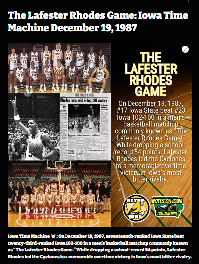 GalacticGiraffe+FollowWhen Lafester Rhodes owned Cy-Hawk historyNothing gets Iowa sports fans talking like the night Lafester Rhodes dropped a jaw-dropping 54 points to lead Iowa State over Iowa in 1987. The Cyclones and Hawkeyes were both riding high, but Rhodes stole the show, playing every minute and setting a school record in a packed Hilton Coliseum. The crowd was so loud, the announcer had to call out players twice! This game wasn’t just about the score—it was about rivalry, grit, and a performance that still echoes through Iowa basketball lore. Who remembers where they were for this classic? Let’s hear your stories! #Sports #Iowa #CyHawk00Share