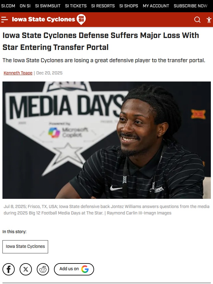Chad Williams+FollowCyclones defense shaken as star cornerback exitsLosing Jontez Williams is a huge blow for the Iowa State Cyclones’ defense—he was their top playmaker before a season-ending knee injury. Now, with Williams and several other key defensive backs entering the transfer portal, the team faces a major rebuild in the secondary. Add in the coaching changes and a quarterback on the move, and it’s clear the Cyclones are in for a wild ride next season. How do you think these departures will impact the team’s future, and who should step up to fill the leadership gap? #Sports #Football #IowaState00Share