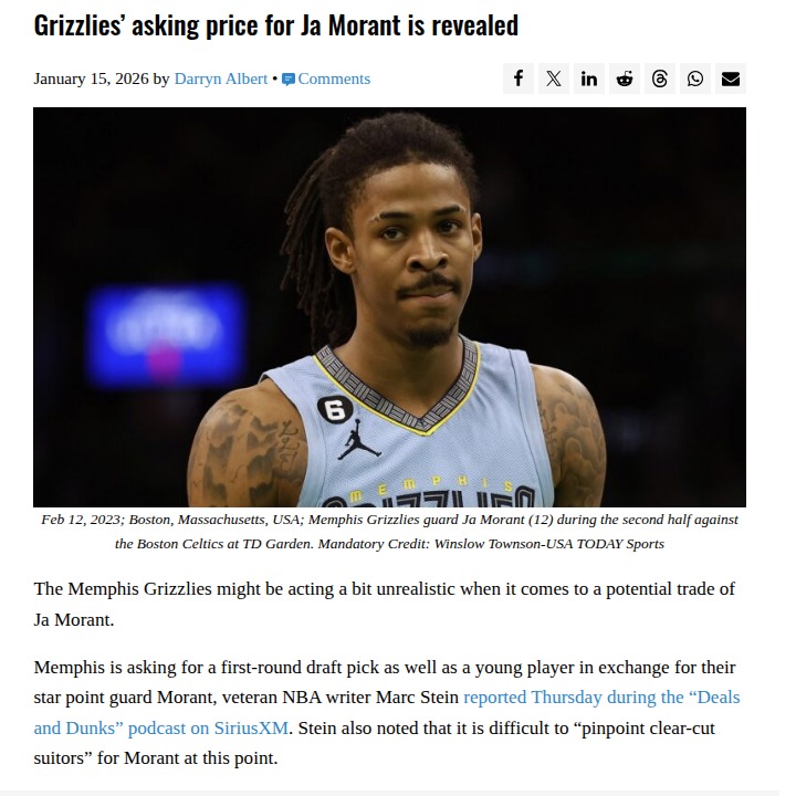 Nicole Obrien+FollowIs Ja Morant Worth the Grizzlies’ Price?So the Grizz are reportedly asking for a first-rounder and a young player for Ja Morant, but is anyone really biting? Sure, Ja’s got All-Star credentials, but between his injuries, the big contract, and all the locker room drama, it feels like Memphis might be dreaming a little. Unless they drop the price, we might see Ja stuck in Grind City past the deadline. Thoughts on where he could actually land? #Sports #Basketball #JaMorant00Share