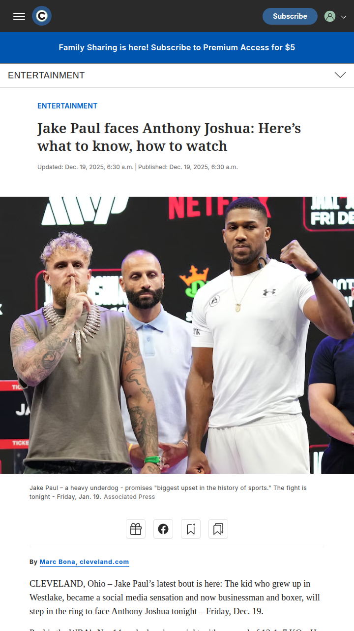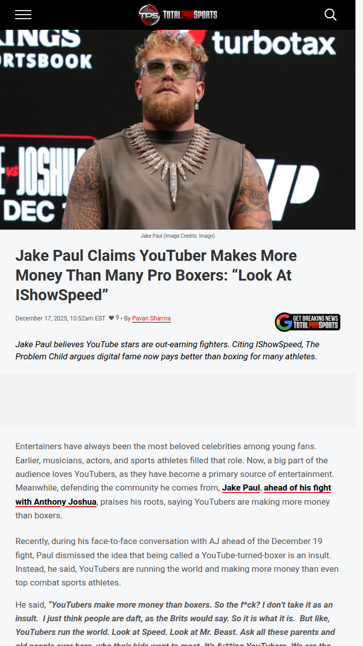 Cathy Sullivan+FollowJake Paul vs Anthony Joshua: YouTuber Pay DebateThe Problem Child is stirring the pot again! Ahead of his clash with AJ, Jake Paul doubled down on his YouTuber roots, claiming creators like IShowSpeed and MrBeast are out-earning most pro boxers. He’s not shy about the label, saying YouTubers are the new A-listers. But the real fireworks are coming December 19, with Jake promising the biggest upset in boxing history against the two-time champ. Can Paul really outclass Joshua, or is he biting off more than he can chew? #Sports #Wrestling #JakePaul00Share