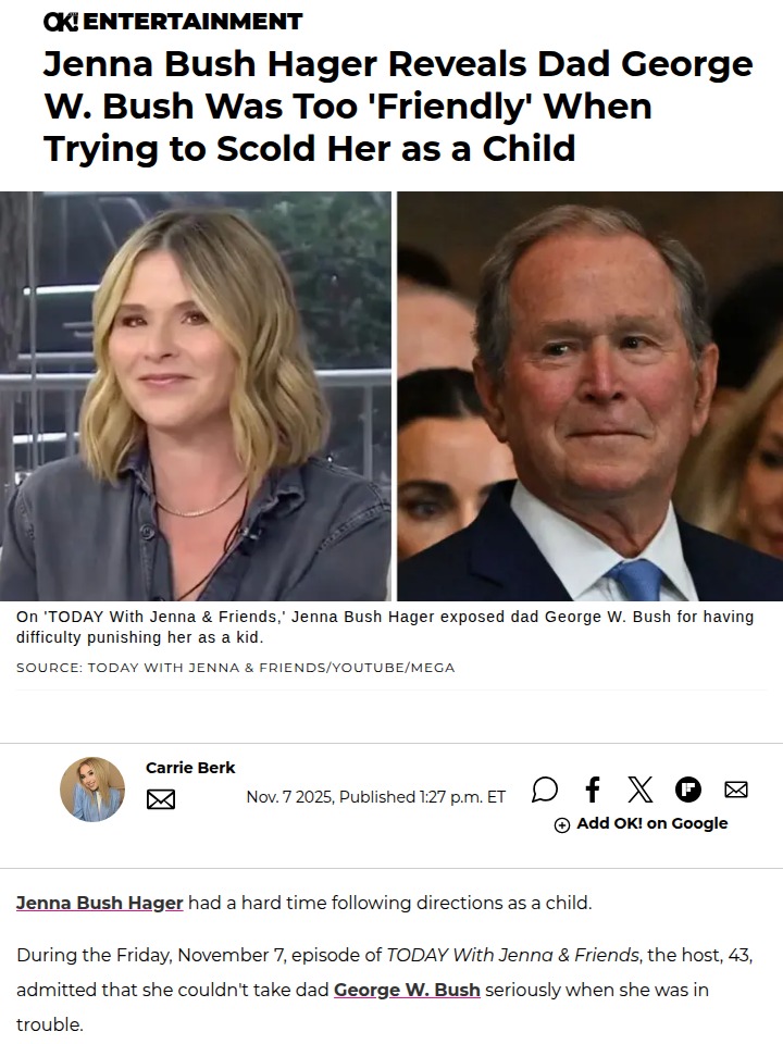 Gina Reynolds+FollowJenna Bush Hager's Dad Drama 😂Jenna Bush Hager just spilled some hilarious tea about her childhood—she says her dad, George W. Bush, was way too friendly to actually scare her when she was in trouble! Fans are debating if being 'too nice' as a parent really works, especially when your dad is a former president. Is this why Jenna's own kids laugh off her scolding now? Parenting plot twist! #Entertainment #Celebrity #JennaBushHager50Share