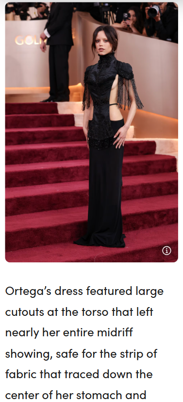 Chad Kemp+FollowJenna Ortega’s Golden Globes Look Sparks Debate 🖤Did anyone else catch Jenna Ortega’s Golden Globes outfit? It was like Wednesday Addams but make it red carpet! Fans are split—some say she’s method dressing, others think she’s just playing it safe by sticking to her Wednesday vibe. The cutouts and sparkles were a bold twist though. Is she leaning too hard into her Netflix persona or just giving the fans what they want? The fandom is definitely buzzing! #Entertainment #Celebrity #JennaOrtega30Share