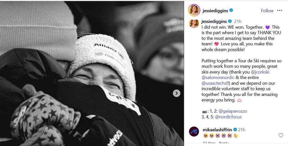 Judith Nelson+FollowDiggins’ Tour de Ski Triumph Moves ShiffrinWhat a moment for Team USA! Jessie Diggins just clinched her third Tour de Ski title, and her emotional shoutout to the behind-the-scenes crew had even the legendary Mikaela Shiffrin tearing up. Diggins’ message—'WE won. Together.'—really highlights how much this sport is about the whole squad, not just the skier on the podium. King Mikaela herself jumped in the comments, showing just how tight-knit and supportive this U.S. ski family is! #Sports #TourDeSki #JessieDiggins00Share