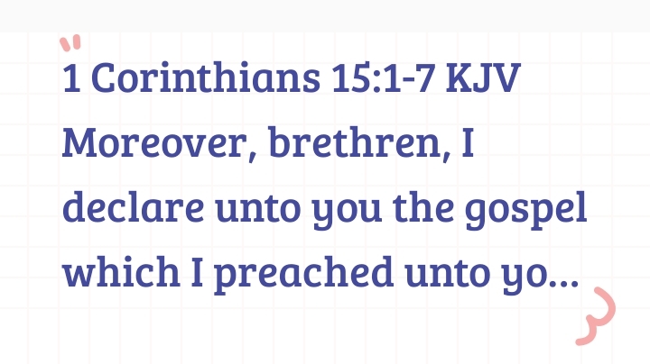 Moreover, brethren, I declare unto you the gospel which I preached unto you, which also ye have received, and wherein ye stand; [2] By which also ye are saved, if ye keep in memory what I preached unto you, unless ye have believed in vain. [3] For I delivered unto you first of all that which I also received, how that Christ died for our sins according to the scriptures; [4] And that he was buried, and that he rose again the third day according to the scriptures: [5] And that he was seen of Cephas, then of the twelve: [6] After that, he was seen of above five hundred brethren at once; of whom the greater part remain unto this present, but some are fallen asleep. [7] After that, he was seen of James; then of all the apostles.