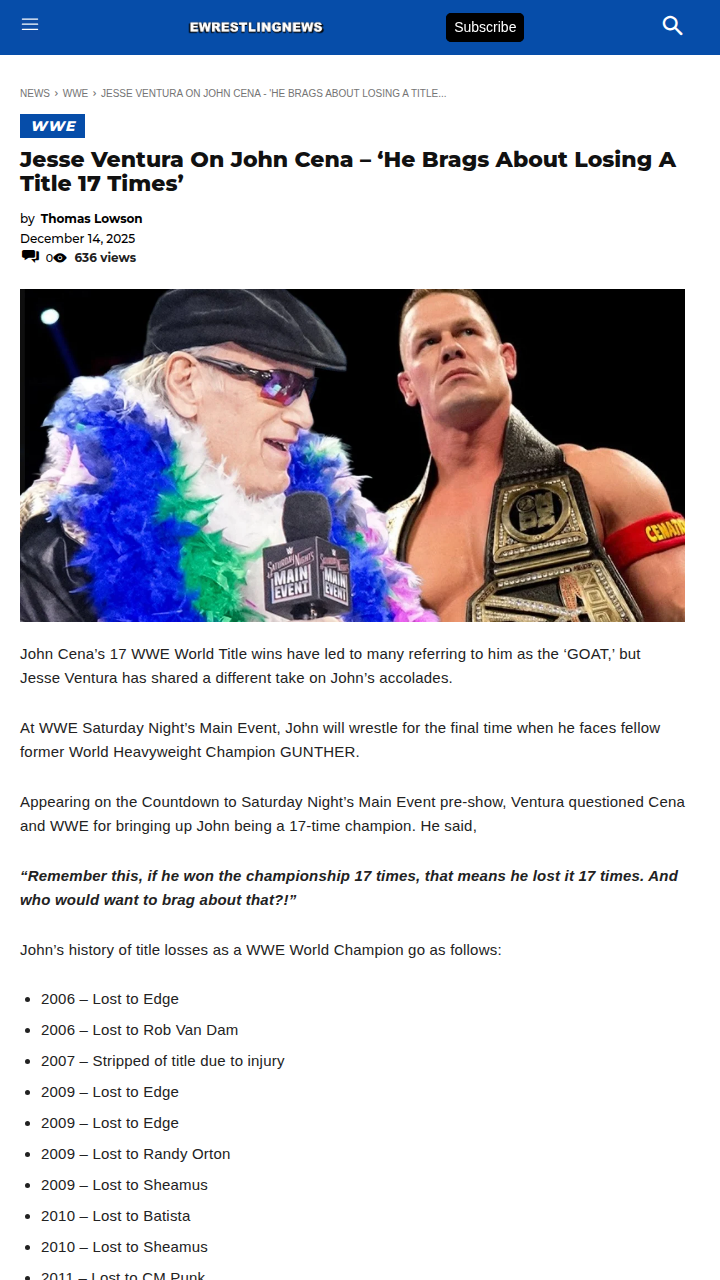 reneewang+FollowJesse Ventura Calls Out Cena’s 17 LossesJesse Ventura just threw some shade at the ‘GOAT’ himself, John Cena, ahead of Cena’s final showdown with GUNTHER at Saturday Night’s Main Event. Ventura pointed out that while King Cena’s 17 WWE World Title wins are legendary, it also means he lost the belt 17 times. Is Ventura onto something, or is this just part of the Cena legacy? Either way, GUNTHER’s promising to make Cena tap—will the Never Give Up mantra hold? #Sports #Wrestling #JohnCena00Share