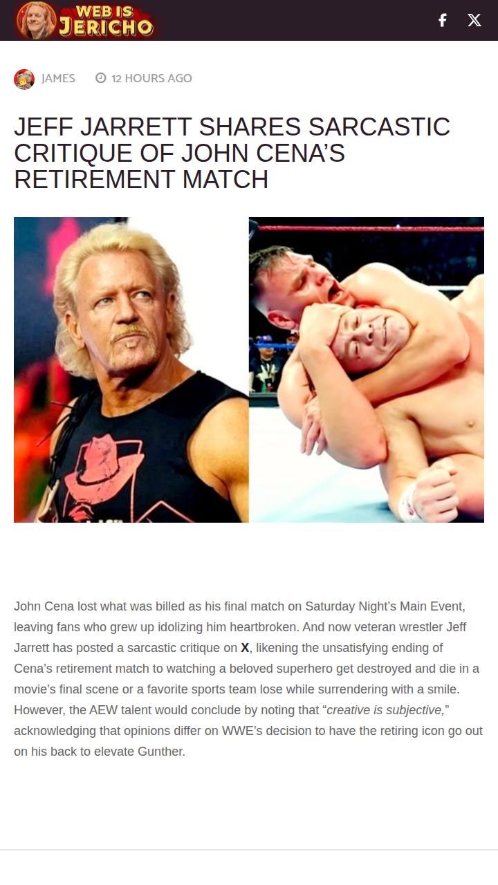 Melissa Wyatt+FollowCena’s Last Stand: Did WWE Get It Right?Heartbreak for the Cenation! John Cena’s final match ended with him doing the honors for Gunther, and Double J Jeff Jarrett couldn’t resist a jab—comparing it to your favorite superhero losing with a smile. While Jarrett admits “creative is subjective,” it’s classic wrestling tradition for legends to pass the torch on their way out. But after Sting’s victorious AEW farewell, should WWE have let Cena go out on top? Let’s hear your takes! #Sports #Wrestling #JohnCena00Share