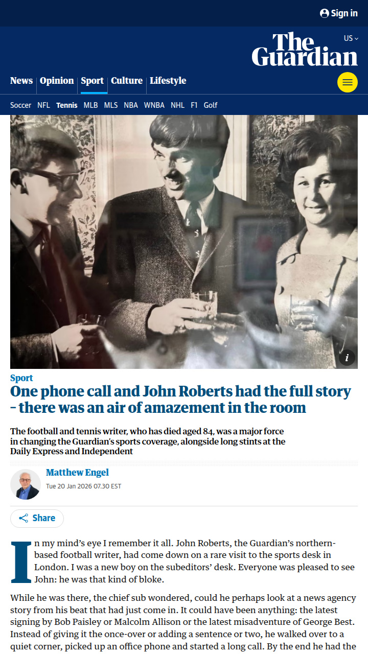 andersonkaren+FollowRemembering John Roberts: The Best’s InsiderAnyone else hear the legendary tale of John Roberts and his one-call scoop? The Guardian’s own northern maestro wasn’t just a newsman—he was George Best’s ghostwriter and a force behind the paper’s sharper sports coverage. That one phone call on the London desk, where he got the full story while others just skimmed, is still talked about. Roberts’ legacy is a reminder of what real insider reporting looks like! #Sports #JohnRoberts #GeorgeBest20Share