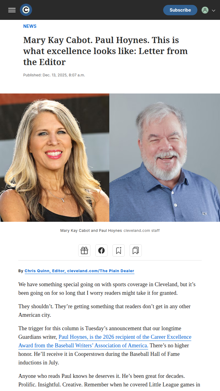 davidsonbrandon+FollowCleveland’s sportswriters set a new standardTwo of Cleveland’s own, Paul Hoynes and Mary Kay Cabot, just scored the top national honors in baseball and football writing—both in the same year! That’s not just rare, it’s practically unheard of. Their relentless drive and fresh excitement for every story are why Cleveland fans get coverage you simply can’t find anywhere else. Add in the rest of the newsroom’s all-star lineup, and it’s clear: Cleveland sports fans are getting something truly special. How does this level of coverage shape your experience as a fan? #Sports #ClevelandSports #Journalism00Share