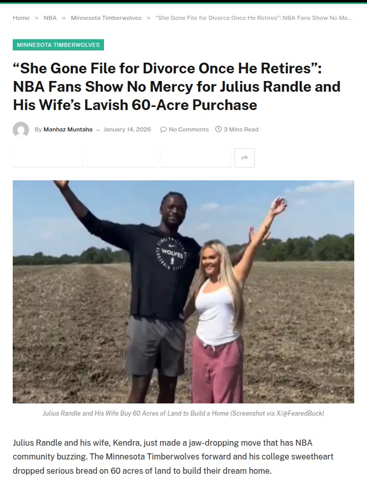Amanda Robbins+FollowJulius Randle’s 60-Acre Flex Sparks Divorce Rumors 🤔Julius Randle and his wife Kendra just bought a massive 60-acre property, but NBA fans are way more interested in speculating about their marriage than the dream home. The wildest take? That Kendra will file for divorce as soon as Julius retires! The internet is convinced it’s all about the money, even though they’ve been together since college. Why can’t fans just let them live? #Entertainment #Celebrity #JuliusRandle12Share