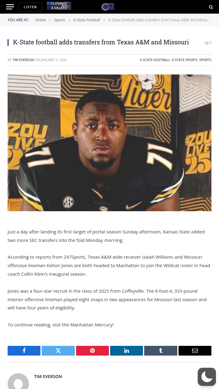 Amy Williams+FollowK-State football lands SEC talent boostKansas State football just got a major upgrade—two SEC transfers are joining the Wildcats for Collin Klein’s first season as head coach. Wide receiver Izaiah Williams from Texas A&M and offensive lineman Keiton Jones from Missouri are headed to Manhattan. Jones, a highly-rated recruit, brings four years of eligibility and serious size to the roster. This move could shake up the team’s offense and set the tone for a new era. What do you think these additions mean for K-State’s chances this season? Let’s hear your take! #Sports #Football #KState00Share