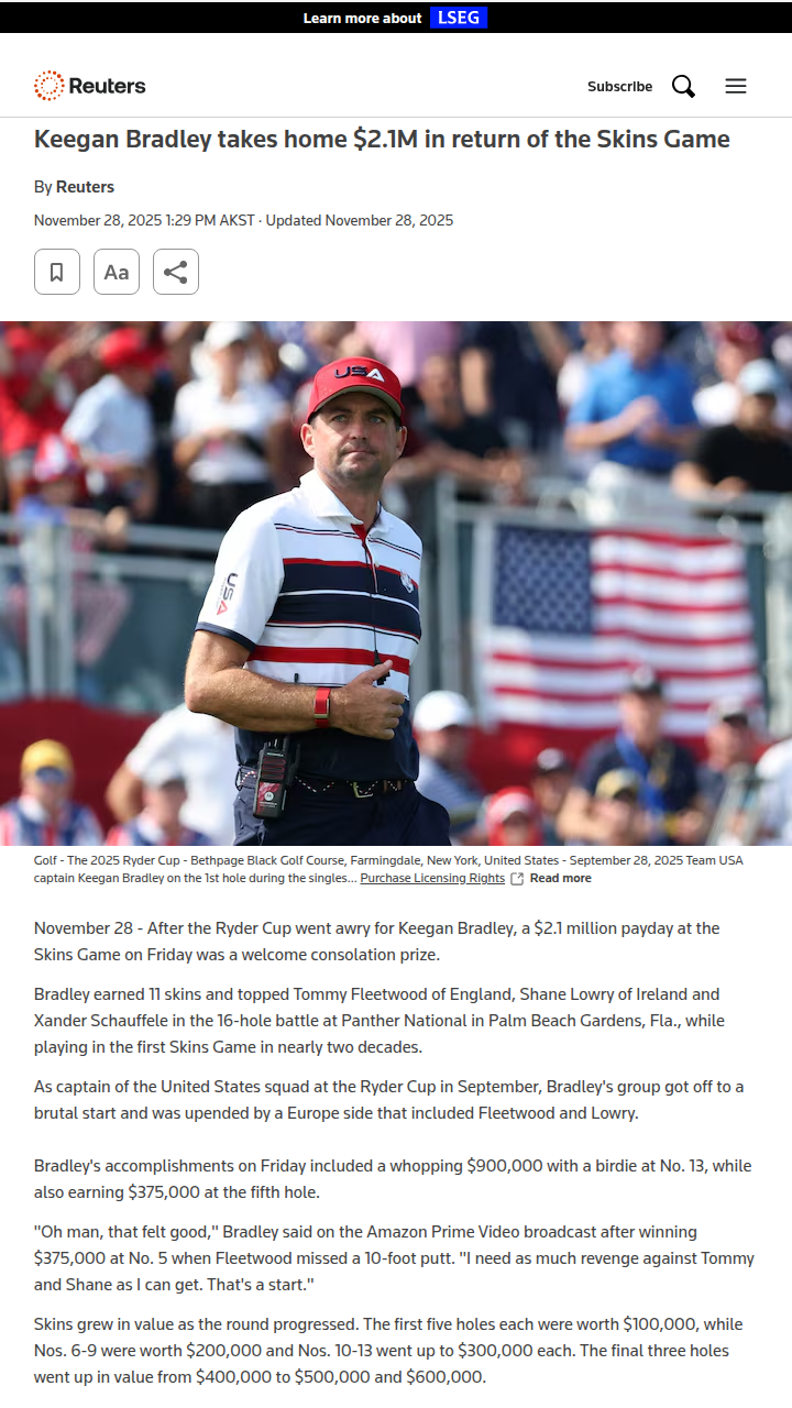 Gabriella Gonzalez+FollowKeegan Bradley’s $2.1M Skins Game comebackKeegan Bradley just turned the tables after a tough Ryder Cup by pocketing a massive $2.1 million at the revived Skins Game in Palm Beach Gardens. He racked up 11 skins, including a single $900,000 birdie, outplaying Tommy Fleetwood, Shane Lowry, and Xander Schauffele. The stakes kept rising with each hole, making every shot count—especially after Bradley’s Ryder Cup squad was toppled by Fleetwood and Lowry’s team. This Skins Game, the first since 2008, brought big drama and even bigger payouts. What do you think—should the Skins Game become a regular event again? #Sports #Golf #KeeganBradley20Share
