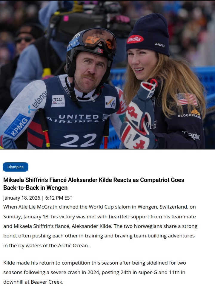 Jacob Morris+FollowMcGrath Goes Back-to-Back in Wengen!Atle Lie McGrath just pulled off a rare feat—back-to-back World Cup slalom wins in Wengen! His teammate and fellow Norwegian, Aleksander Kilde (aka Shiffrin’s guy), was quick to show love on social. These two have a tight bond, and you can tell Kilde’s support means a lot. With McGrath now up to five slalom wins, is he Norway’s next big thing? Let’s talk about this rising rivalry on the slopes! #Sports #McGrath #Kilde00Share