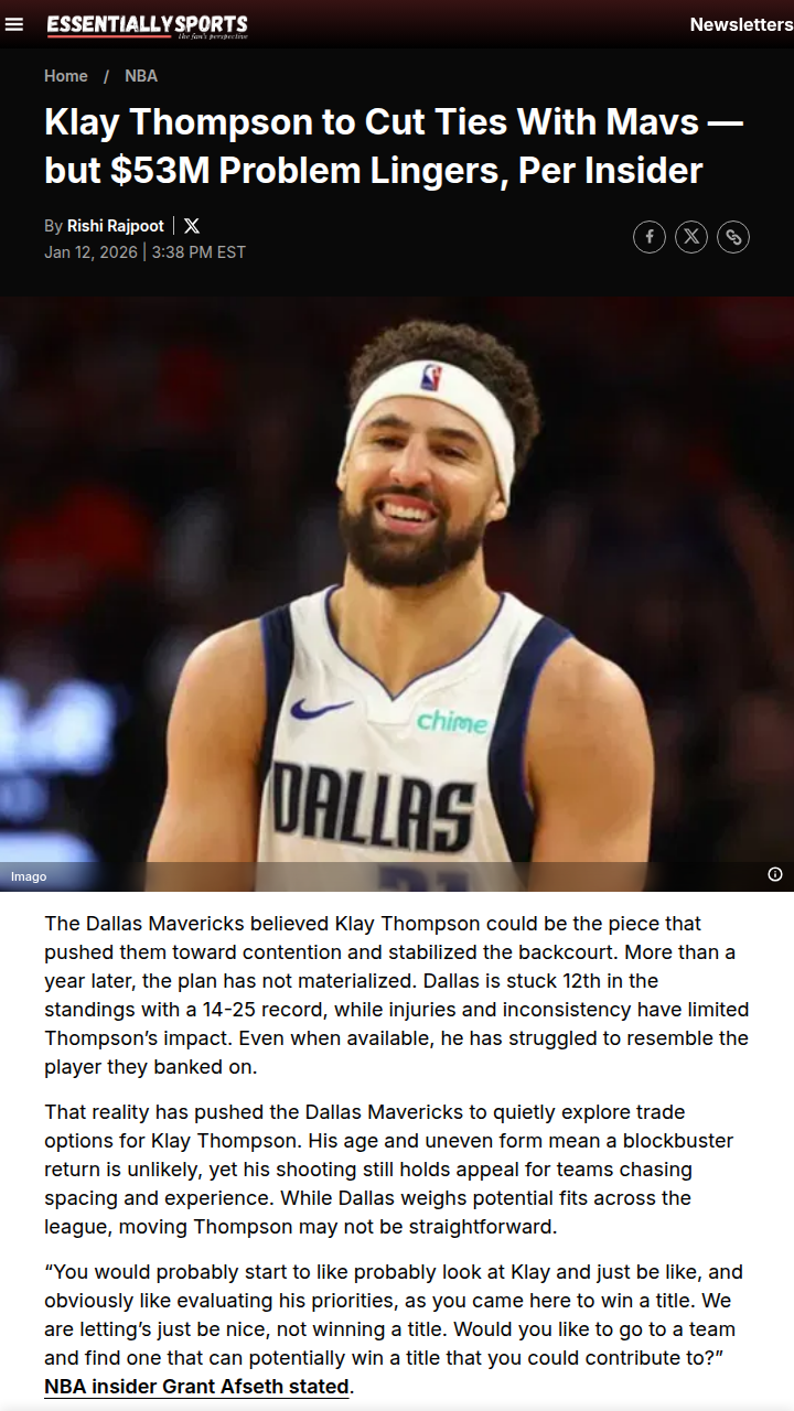 summersivan+FollowShould the Dubs Bring Klay Home?Mavs fans, it looks like the Klay Thompson experiment just isn’t working out in Dallas. The Mavs are stuck in 12th, and Klay’s struggled to find his old Splash Brother form. Now, trade rumors are swirling, but his $53M contract and the tough-to-move deals for Caleb Martin and Jaden Hardy are big obstacles. Some insiders (and even Jeff Teague) are floating a Warriors reunion. Would Klay back with Steph really spark another run, or is this just nostalgia? #Sports #Basketball #KlayThompson00Share