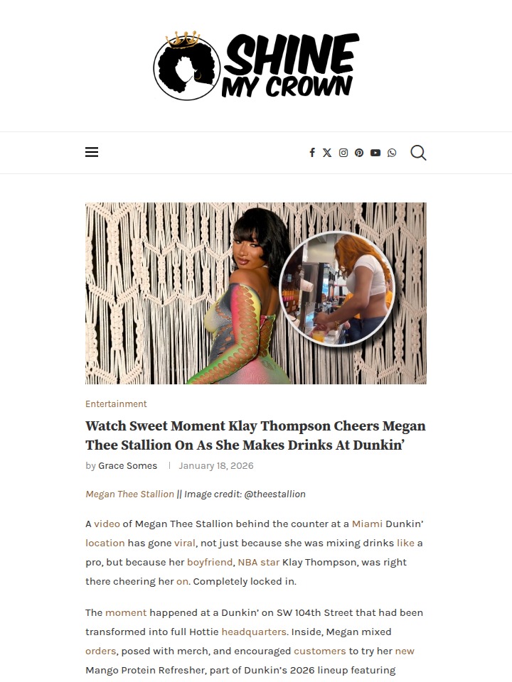 guerrajohn+FollowKlay ‘The Splash Bro’ Cheers on Megan at Dunkin’How about this for a power couple moment? Klay “The Splash Bro” Thompson was spotted hyping up Megan Thee Stallion as she took over a Miami Dunkin’—mixing up her new Mango Protein Refresher for fans. The Dallas Mavericks guard looked every bit the proud boyfriend, and fans can’t get enough of the supportive energy. The pop-up even sold out of those “Hot Girls Run on Dunkin’” cups! Is this the most wholesome NBA off-court moment we’ve seen lately? #Sports #Basketball #KlayThompson10Share