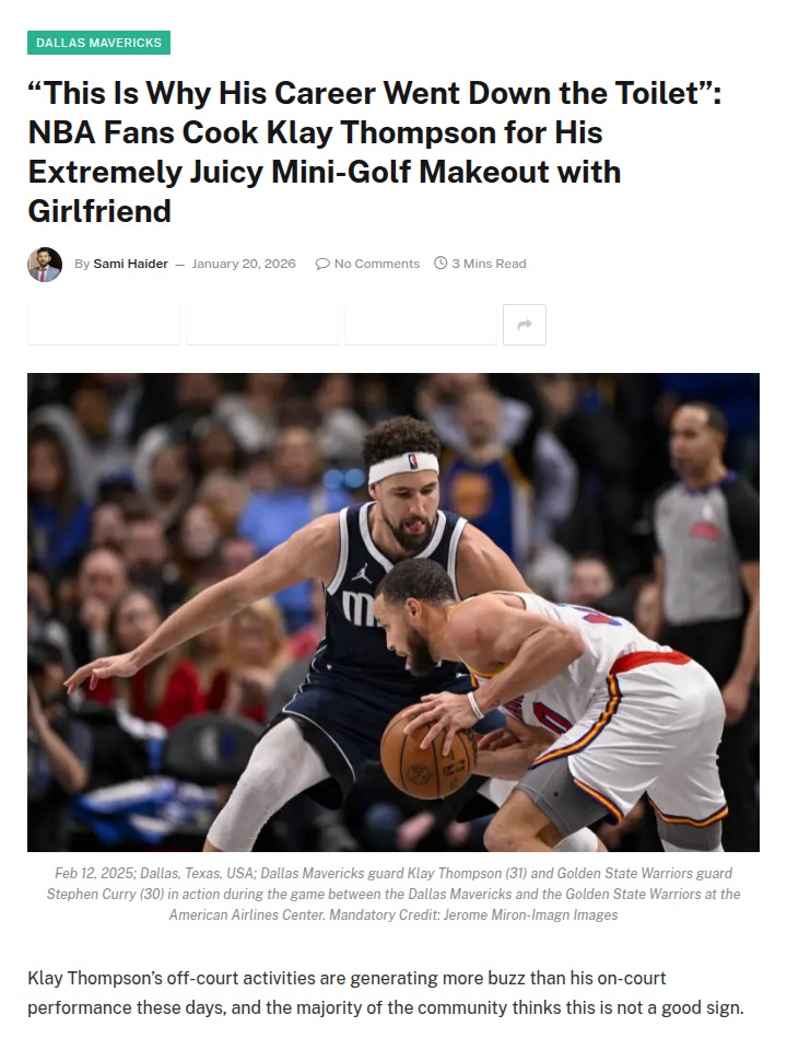 Brian Gaines+FollowKlay Thompson & Megan Thee Stallion Go ViralLooks like Klay “Game 6” Thompson is making more headlines off the court than on it lately. NBA Twitter is buzzing after the Mavs sharpshooter was caught in a steamy mini-golf date with Megan Thee Stallion. Fans are roasting Klay for his priorities, especially since his numbers this season are a far cry from his Warriors glory days. Is this just classic celebrity scrutiny, or is the Mavs’ new star really losing focus? #Sports #Basketball #KlayThompson51Share