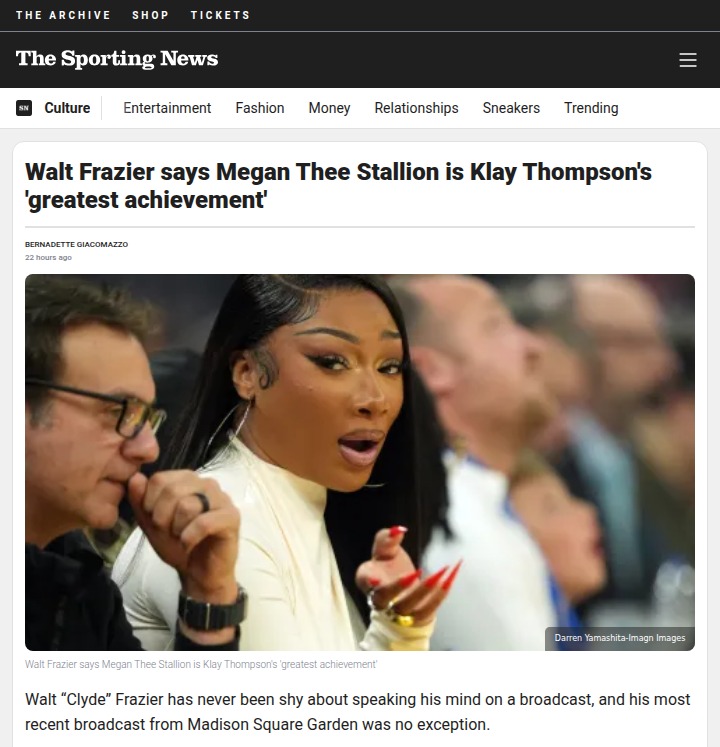 guerrajohn+FollowMSG Broadcast: Frazier Trolls Klay Over MeganOnly on MSG do you get moments like this: as the Mavs handled the Knicks, Walt “Clyde” Frazier took a break from Klay Thompson’s on-court legacy to joke that his real achievement is Megan Thee Stallion. Even Mike Breen was caught off guard! Forget the box score—this viral moment is the real highlight. Is Clyde just having fun, or is Klay’s off-court life now part of his legend? #Sports #Basketball #KlayThompson00Share