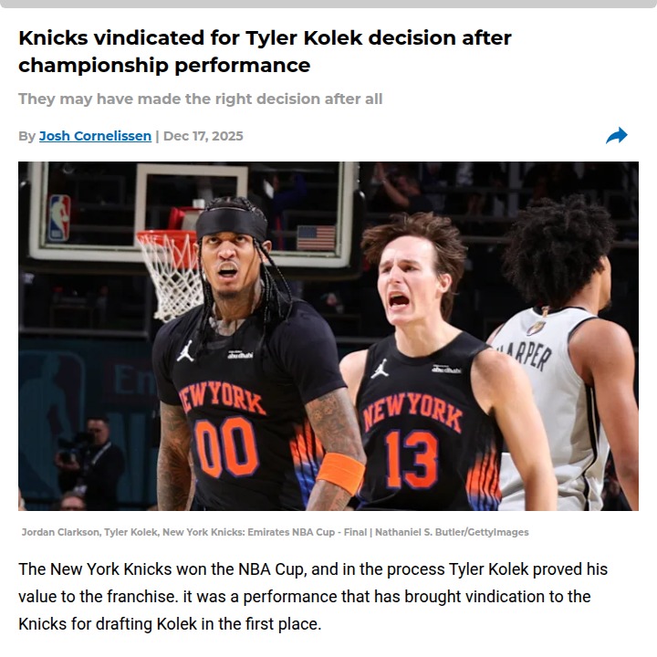 guerrajohn+FollowTyler Kolek’s clutch play seals Knicks’ NBA CupTyler Kolek just changed the narrative for the Knicks in a big way. When New York needed someone to step up in the NBA Cup Final, Kolek delivered—locking down on defense, making smart passes, and closing out the game over bigger names. Just months ago, his spot on the roster was shaky, with rumors swirling about trades. Now, after this championship performance, it’s clear the Knicks’ faith in their second-year point guard paid off. What do you think—should Kolek be a permanent part of the Knicks’ core moving forward? #Sports #Basketball #Knicks20Share