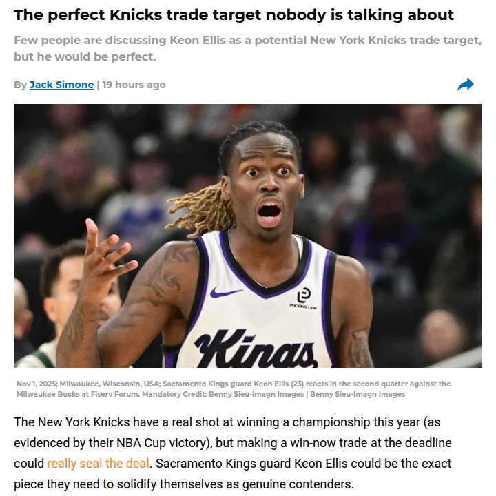 Oscar Gonzalez+FollowWhy the Knicks should target Keon EllisKeon Ellis could be the under-the-radar game-changer the Knicks need to boost their championship run. Despite showing real promise as a 3-and-D guard in Sacramento, Ellis hasn’t found a steady role with the Kings. Imagine him coming off the Knicks’ bench, locking down opposing guards, and hitting threes—exactly what New York’s rotation has been missing. With his defensive skills and reliable shooting, Ellis could be the perfect fit alongside Jalen Brunson and give the Knicks the depth to take on the East’s best. Would you make this move if you were in the front office? #Sports #Basketball #Knicks00Share