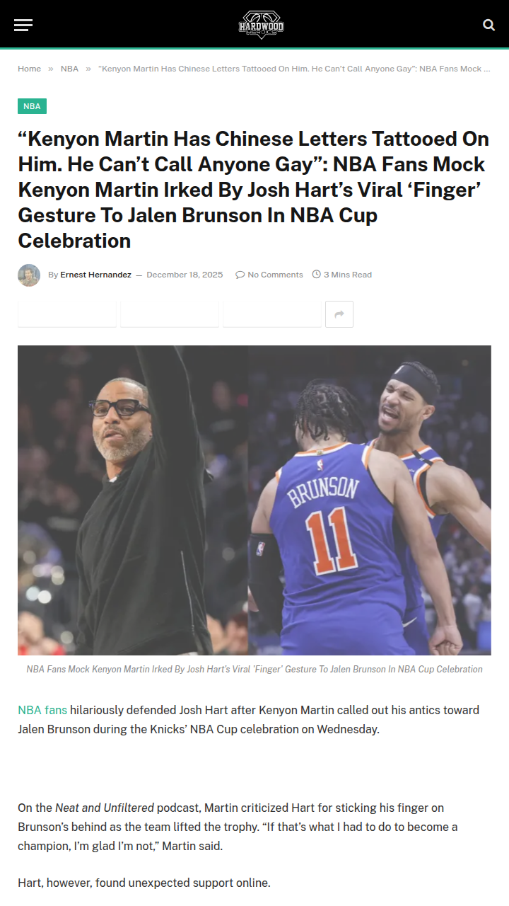 Oscar Gonzalez+FollowKnicks’ NBA Cup Win Sparks Hart-Brunson AnticsThe Knicks finally snagged their first major title since '99, but the real talk is Josh Hart’s viral celebration with Jalen Brunson. K-Mart wasn’t having it, calling out Hart’s playful finger move on the Neat and Unfiltered podcast. Fans clapped back, defending Hart and roasting Martin for his own past antics. Love it or hate it, the Hart-Brunson chemistry (and OG’s 28 points) powered the Knicks past the Spurs. Is this the start of a new Knicks era, or just another meme moment? #Sports #Basketball #Knicks00Share