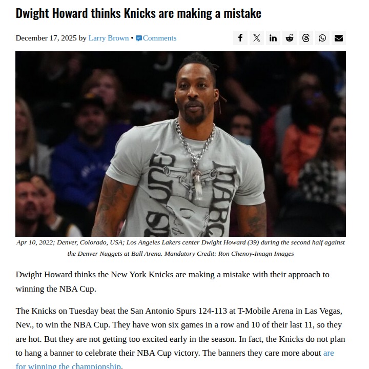 Nicole Obrien+FollowShould Knicks Hang an NBA Cup Banner?Superman Dwight Howard just called out the Knicks for not planning to hang a banner after their NBA Cup win over the Spurs. The Knicks are on fire with six straight Ws, but they're keeping their eyes on the big prize—a championship. Howard says, 'Celebrate your wins while you can.' Knicks fans, do you agree with Dwight, or is it all about the Larry O'Brien? #Sports #Basketball #Knicks11Share